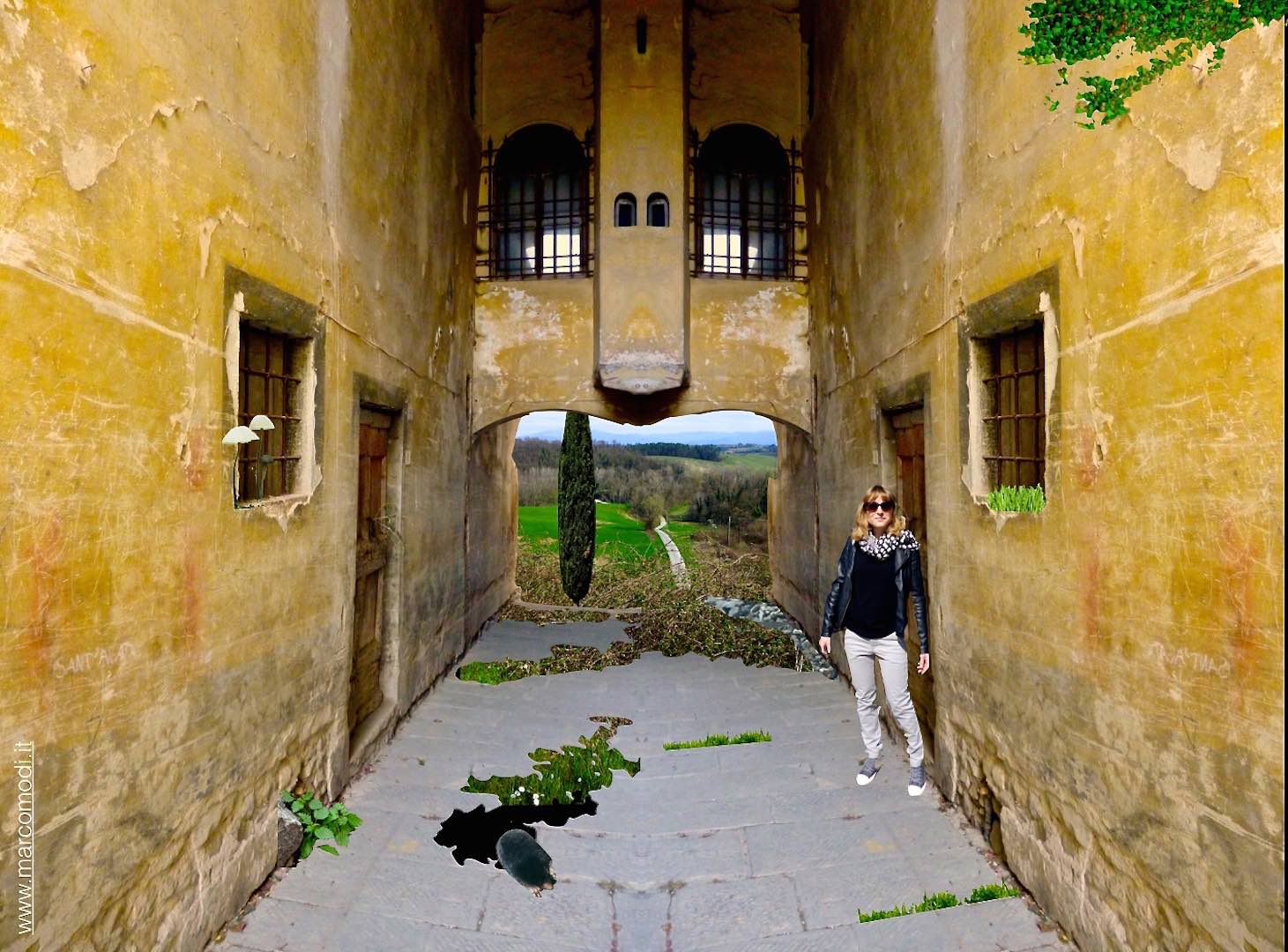 Mancava ancora qualcosa a questo spe-collage: ma cosa ?Era un mese e mezzo che stava lì fermo e irrisolto.Poi improvvisamente da stamani tutto è cambiato, particolari e figure hanno trovato il loro posto, e dopo una giornata di lavoro il collage è ora finito. La coincidenza che ha sbloccato l\'impasse è stato l\'incontro con Caterina.Allora, me ne andavo con Maquis -le petit corse- nel consueto giro mattinale, quando l'ho incontrata. In verità l'incontro spesso...ma oggi che coincidenza! Caterina la conosco fin da bambina e vive attualmente nel particolarissimo Chiasso Salviati . Ora, siccome lo spe-collage a cui lavoravo era proprio sul Chiasso, ho fatto 2+2 e ho chiesto a Caty di mettersi in posa per una fotografia.Chi meglio di Caty poteva vantare diritti a stare in questo collage?Dopo, tutto ha trovato una foce,e le immagini,i ritagli si sono accampati quasi da se stessi. Non possiamo esimerci dal riportare il testo della bellissima canzone - Caterina- di Francesco de Gregori (quante volte l\'ho cantata in auto con l\'autoradio, le playlist su cassette a nastro magnetico).per inciso: -la talpa terragnola che sbuca dalle fenditure del lastricato si chiama Zoe --Nel paesaggio sotto l'arco la piccola strada che scende nel Bagnolo-pubblicato l' 8 maggio 2015Poi arrivò il mattinoe col mattino un angeloe quell\'angelo eri tu,con due spalle uccellinoin un vestito troppo piccoloe con gli occhi ancora blu.E la chitarra veramente la suonavi molto male,però quando cantavisembrava Carnevale,e una bottiglia ci bastava per un pomeriggio intero,a raccontarlo ogginon sembra neanche vero.E la vita Caterina, lo sai, non è comoda per nessuno,quando vuoi gustare fino in fondo tutto il suo profumo.Devi rischiare la notte, il vino e la malinconia,la solitudine e le valigie di un amore che vola via.E cinquecento catenelle che si spezzano in un secondoe non ti bastano per piangere le lacrime di tutto il mondo.Chissà se in quei momenti ti ricordi della mia faccia,quando la notte scende e ti si gelano le braccia.Ma se soltanto per un attimo potessi averti accantoforse non ti direi niente ma ti guarderei soltanto.Chissà se giochi ancora con i riccioli sull\'orecchioo se guardandomi negli occhimi troveresti un pò più vecchio.E quanti mascalzoni hai conosciutoe a quanta gente quante volte hai chiesto aiuto,ma non ti è servito a niente.Caterina questa tua canzone la vorrei veder volaresopra i tetti di Firenze per poterti conquistare.