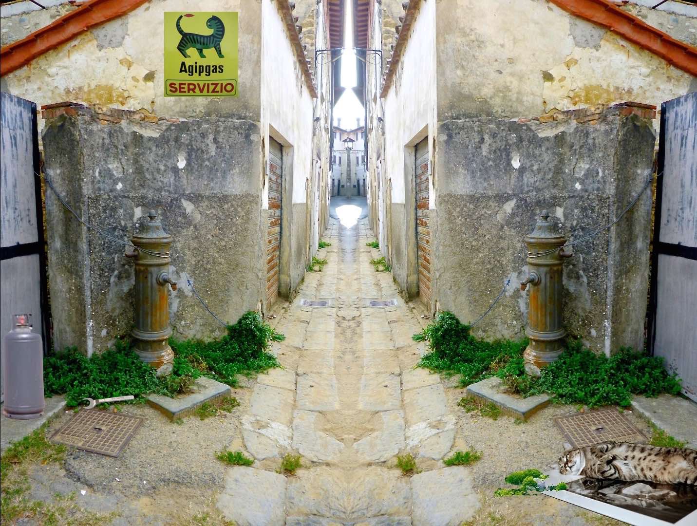 Si cammina per via di Montaccianico verso il centro del paese. Dopo la piazzetta del Sottini si trova lo slargo delle due fontane e la strada si fa sempre più stretta...Nell'immagine il gatto Gino sdraiato sopra un collage.