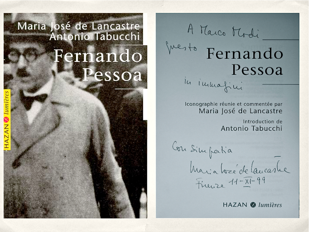 Un incontro per puro caso quello nel novembre del 99 con Maria José de Lancastre.La ringrazio per la dedica e il libro fotografico su Pessoa con l'introduzione di Antonio Tabucchi che qui voglio ricordare.